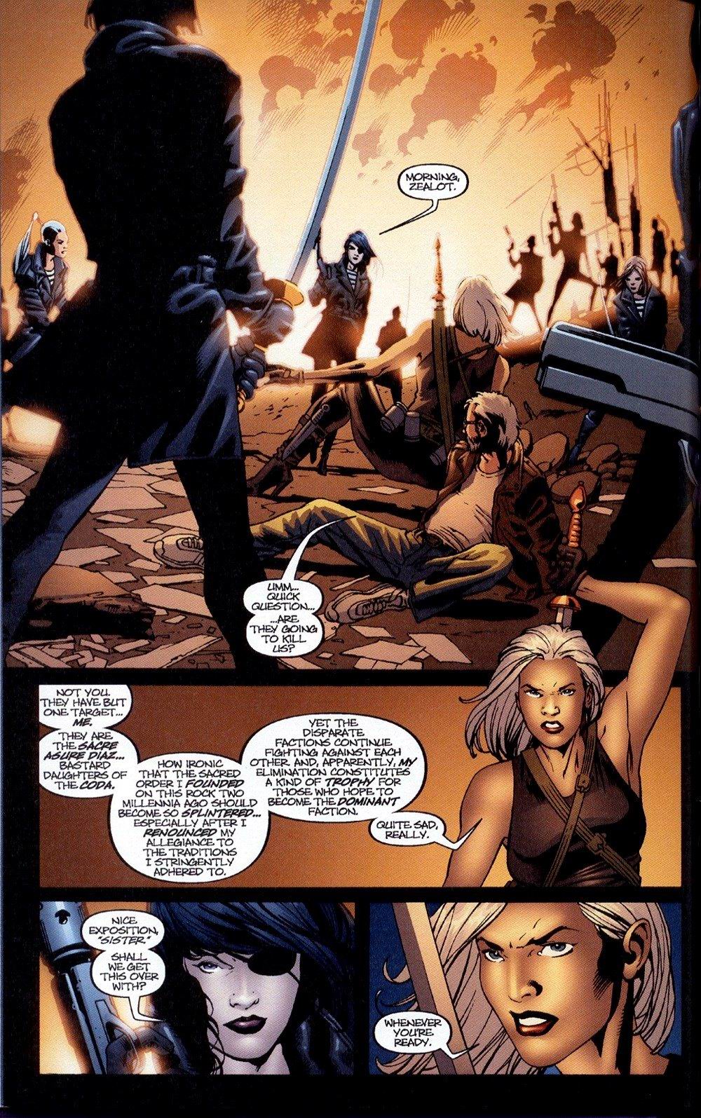 The reason her background is relevant to this fight is because it contributes valuable information to her fighting experience and ability. Zealot knew how to swing swords by the time she could walk. She's been fighting for thousands of years, mastered every martial art known to man (and to Kherubs), and is pretty much peerless in the entire Wildstorm Universe with a blade and is second only to one in hand to hand skill. She was one of the founding members of the Coda, a sisterhood of assassins stationed in Greece who are fierce and trained in all the ways of combat she was. Needless to say, there are few other characters to call upon if you're seeking bloodshed.